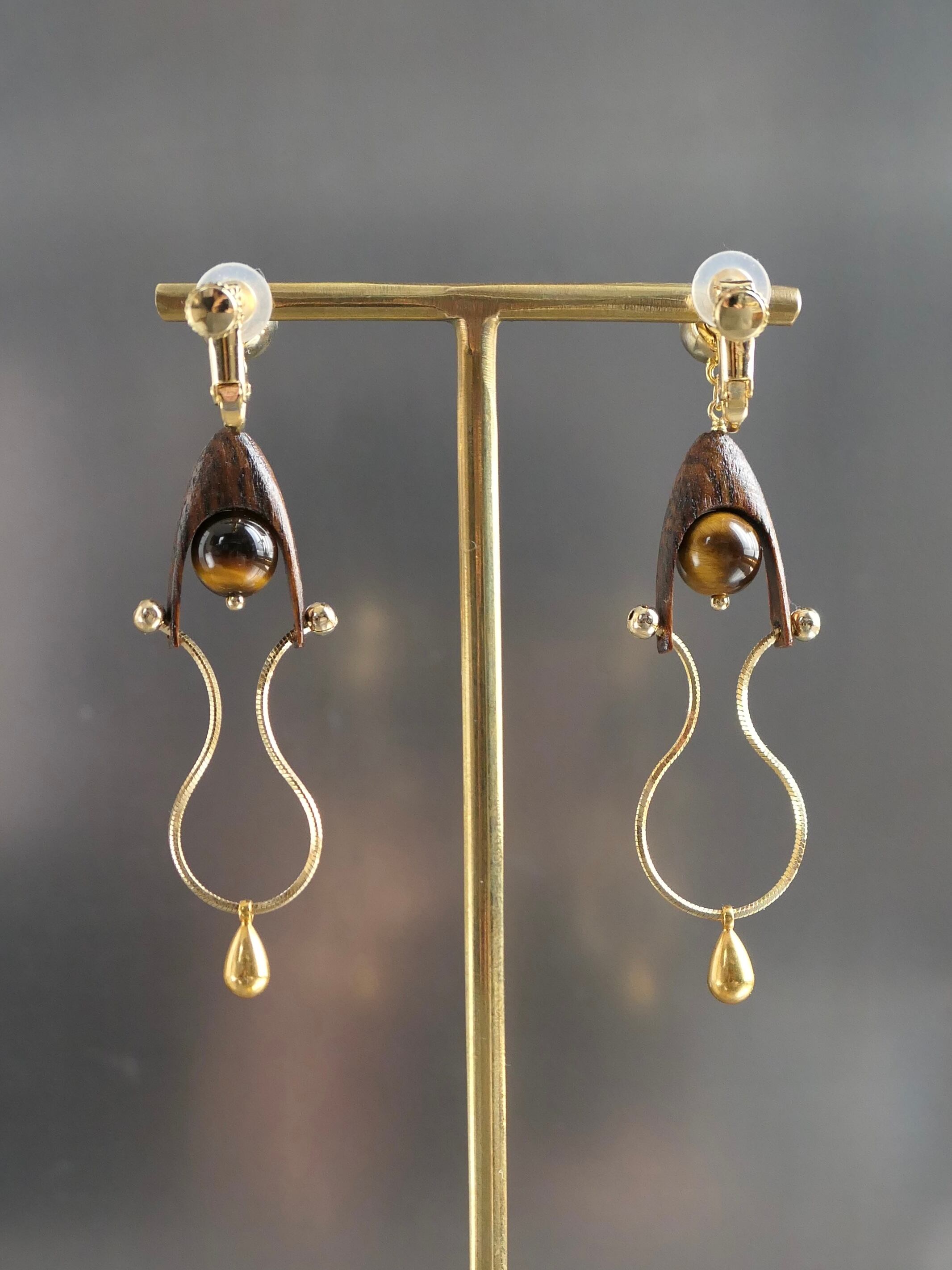 素材:木(リオグランデパリサンダー)、硝子(SWAROVSKI社製のクリスタル)、天然石(タイガーアイ)、真鍮、ステンレス(ピアスポスト)