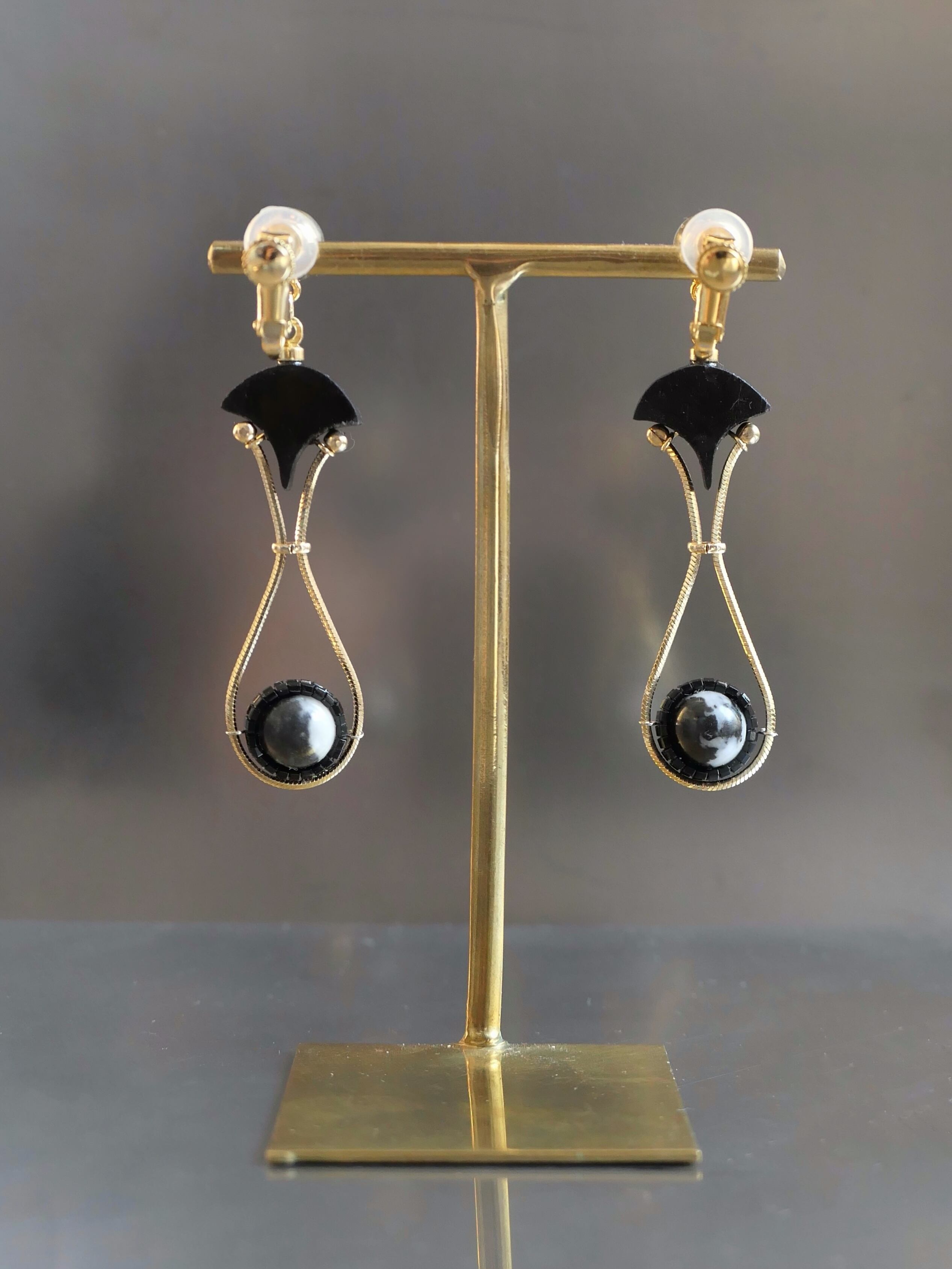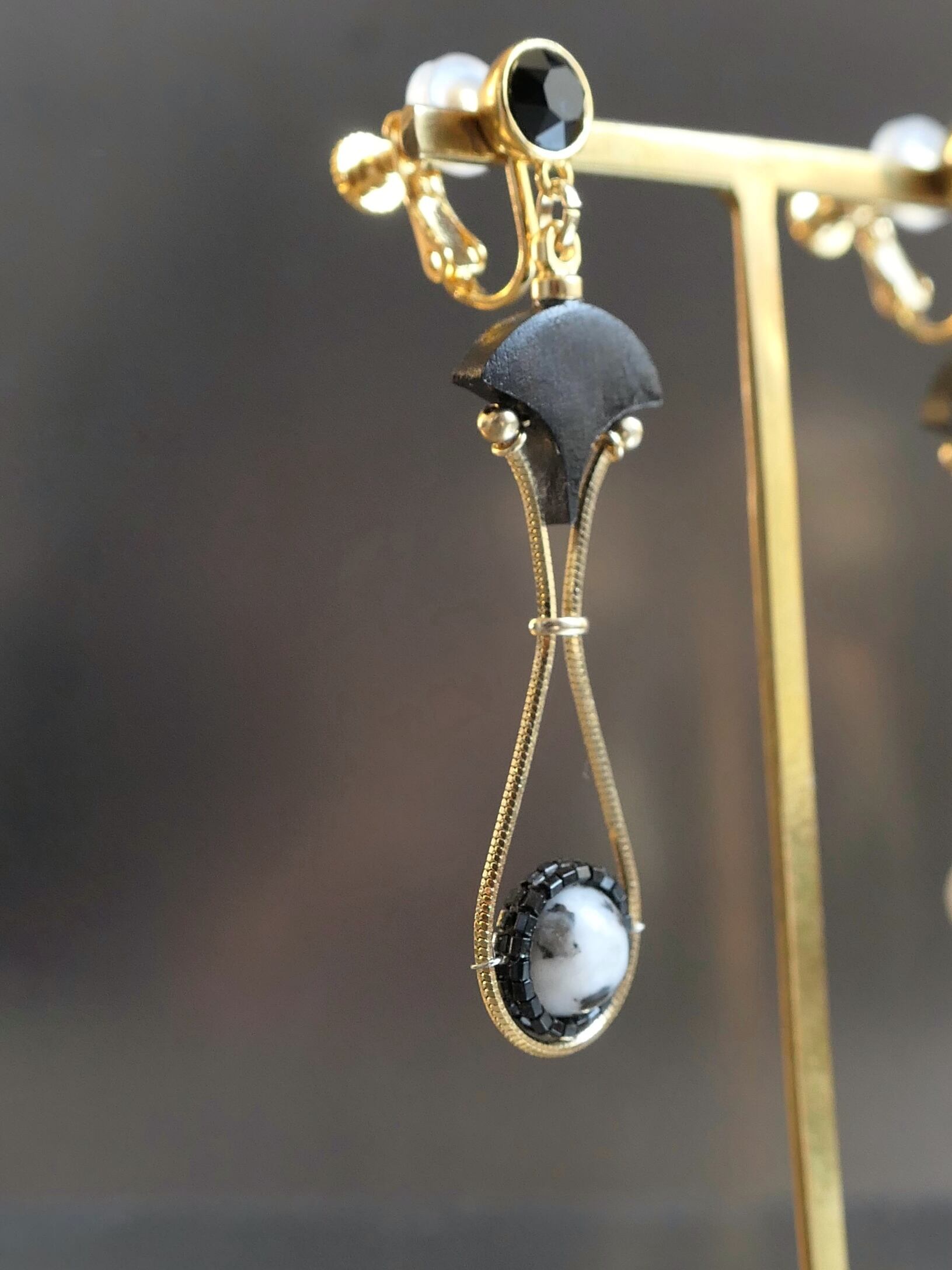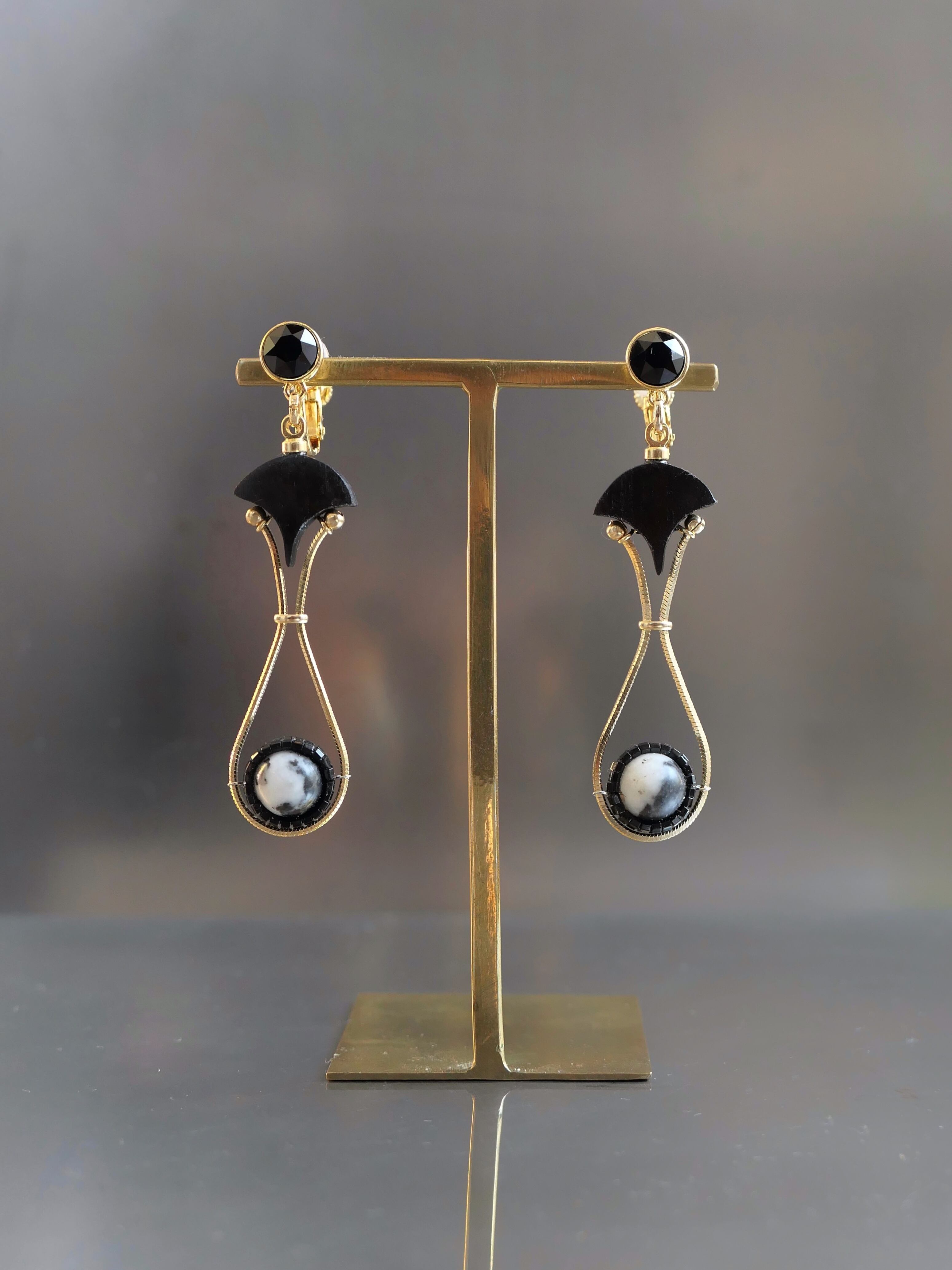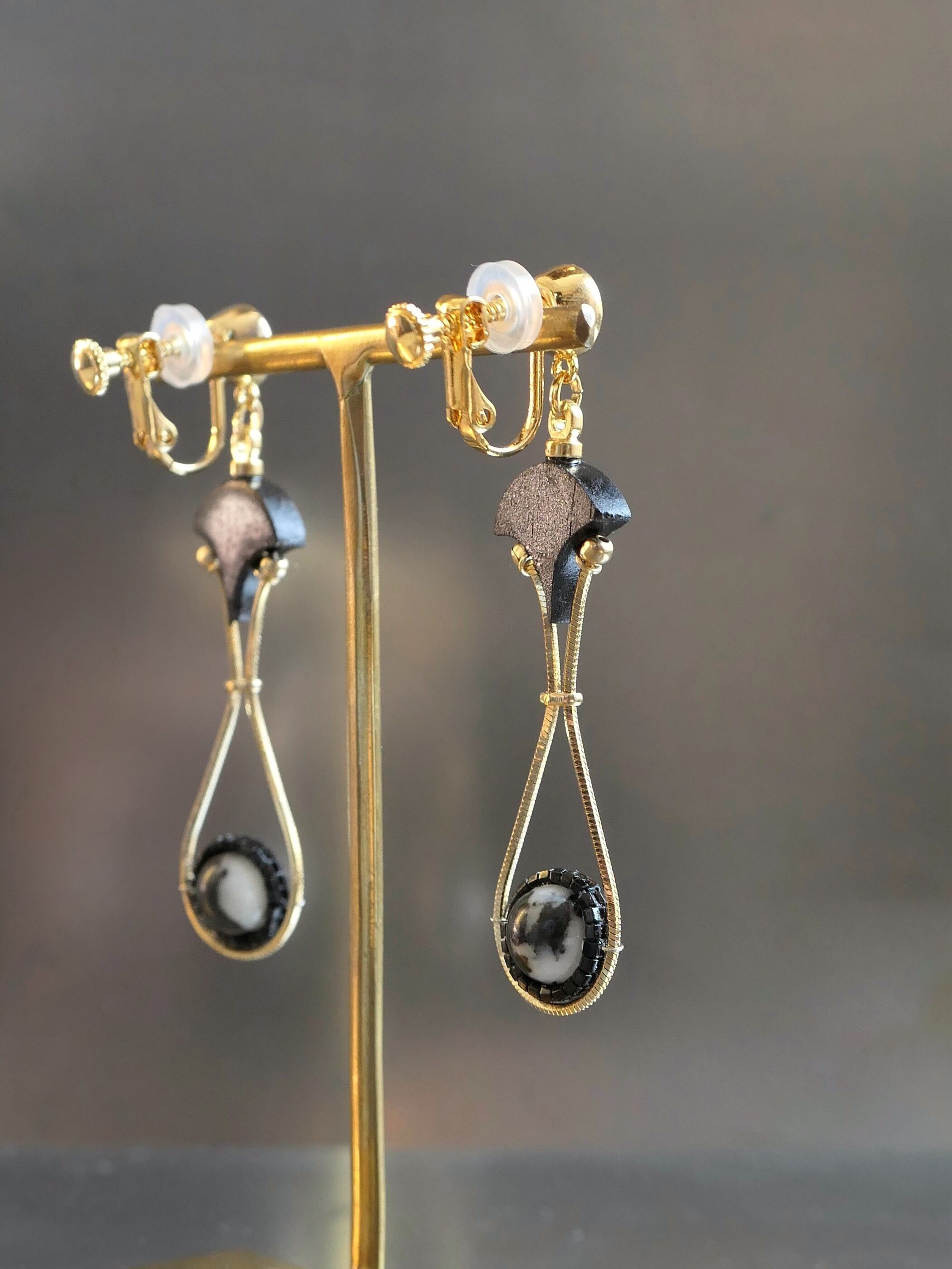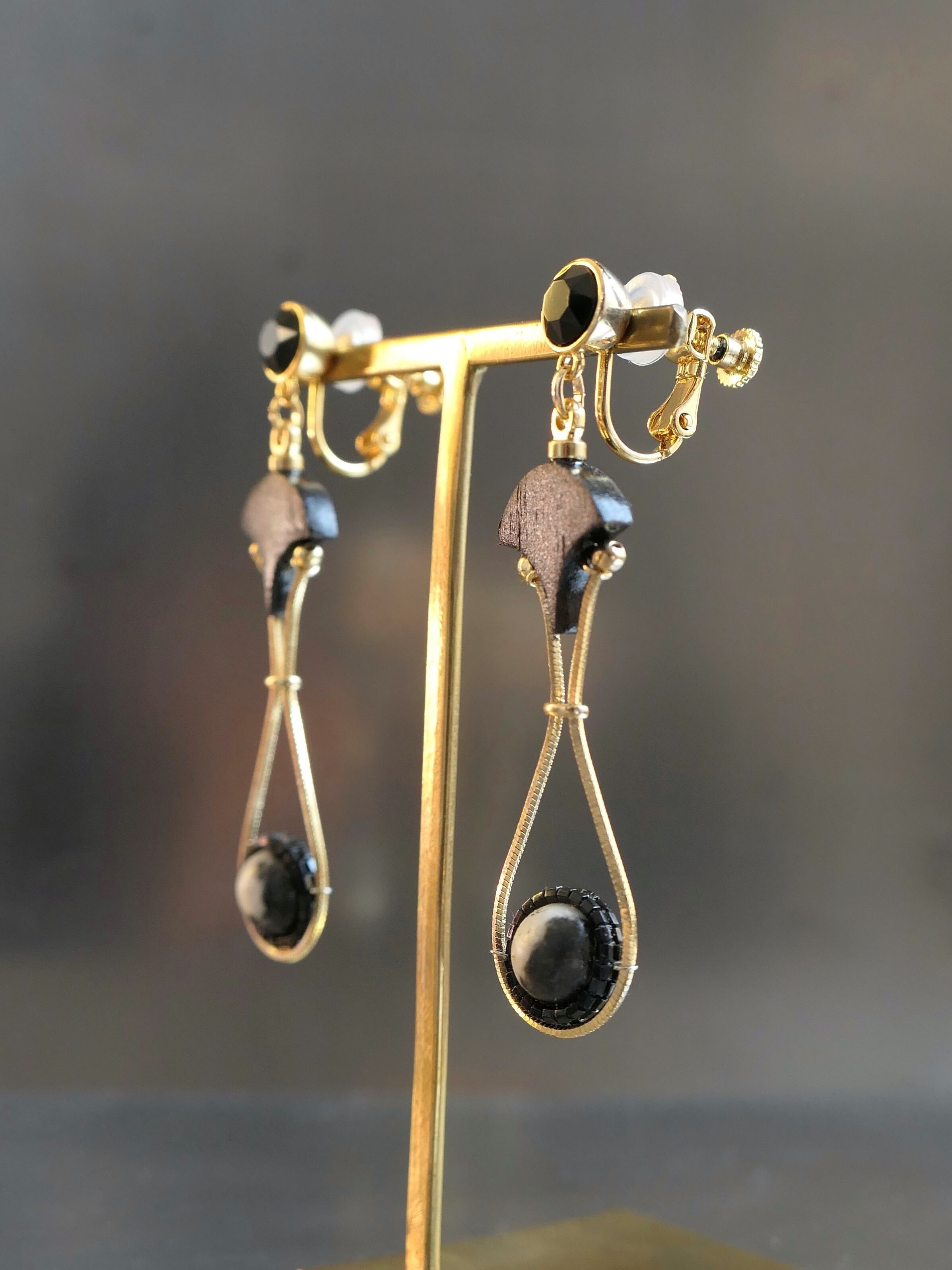 素材:木(アフリカンブラックウッド)、天然石(マダガスカルジャスパー)、硝子(SWAROVSKI社製のクリスタル)、真鍮、ステンレス(ピアスポスト)