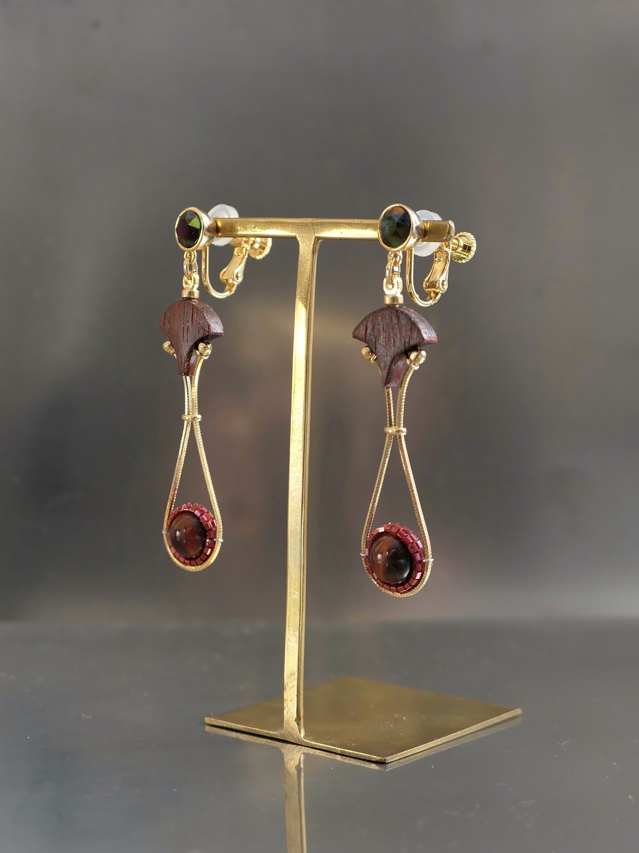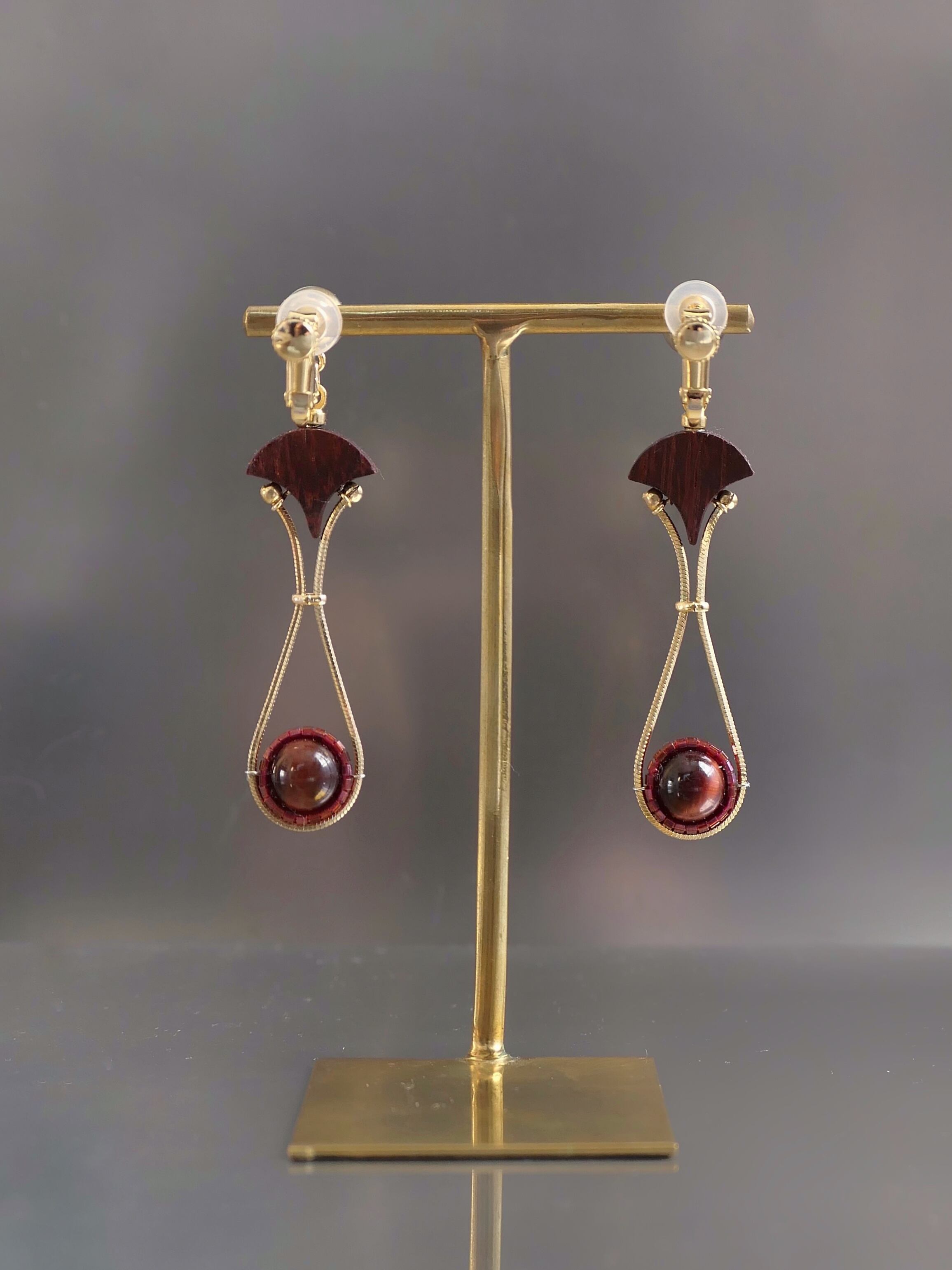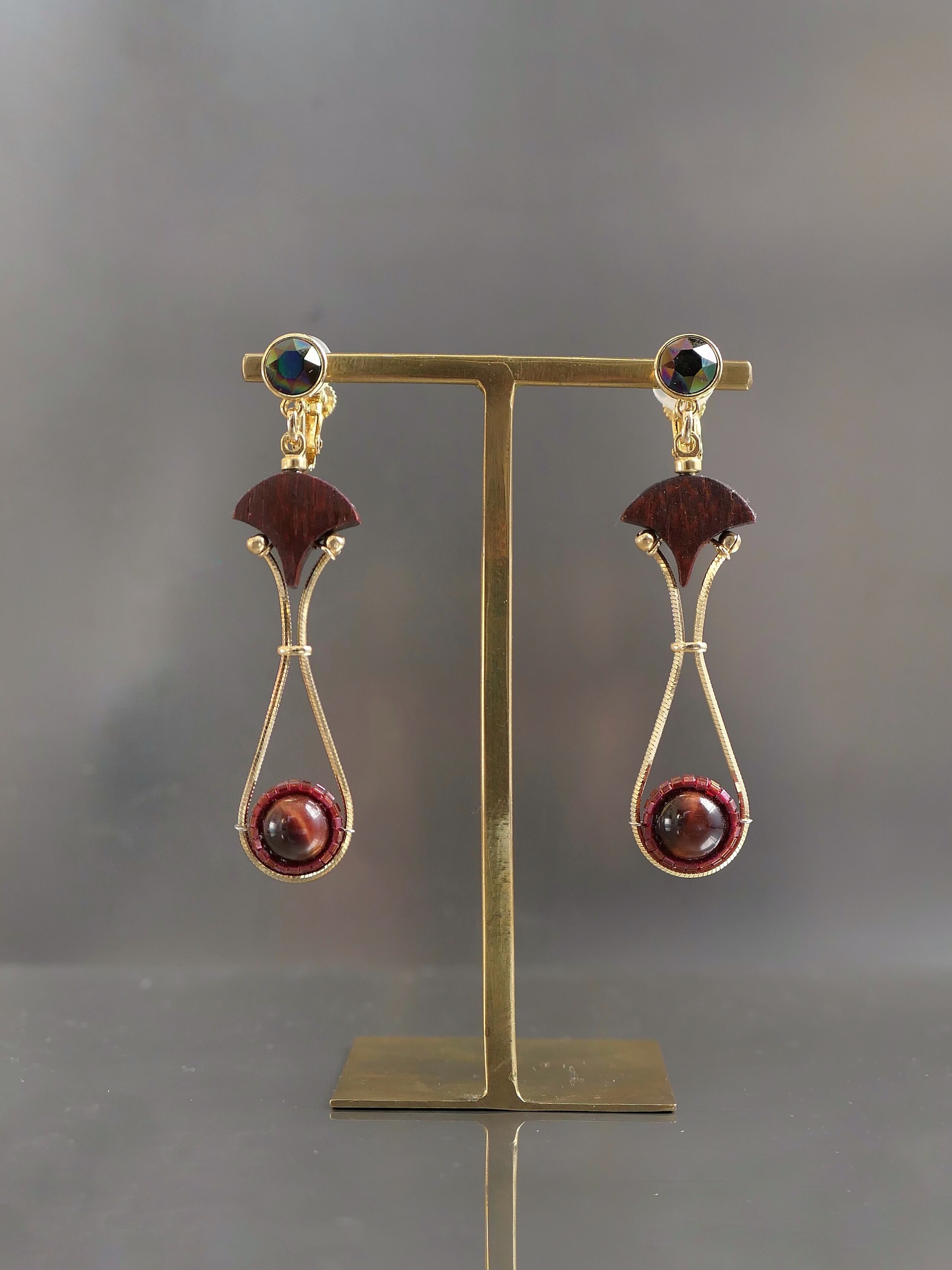 素材:木(パドック)、天然石(タイガーアイ)、硝子(SWAROVSKI社製のクリスタル)、真鍮、ステンレス(ピアスポスト)