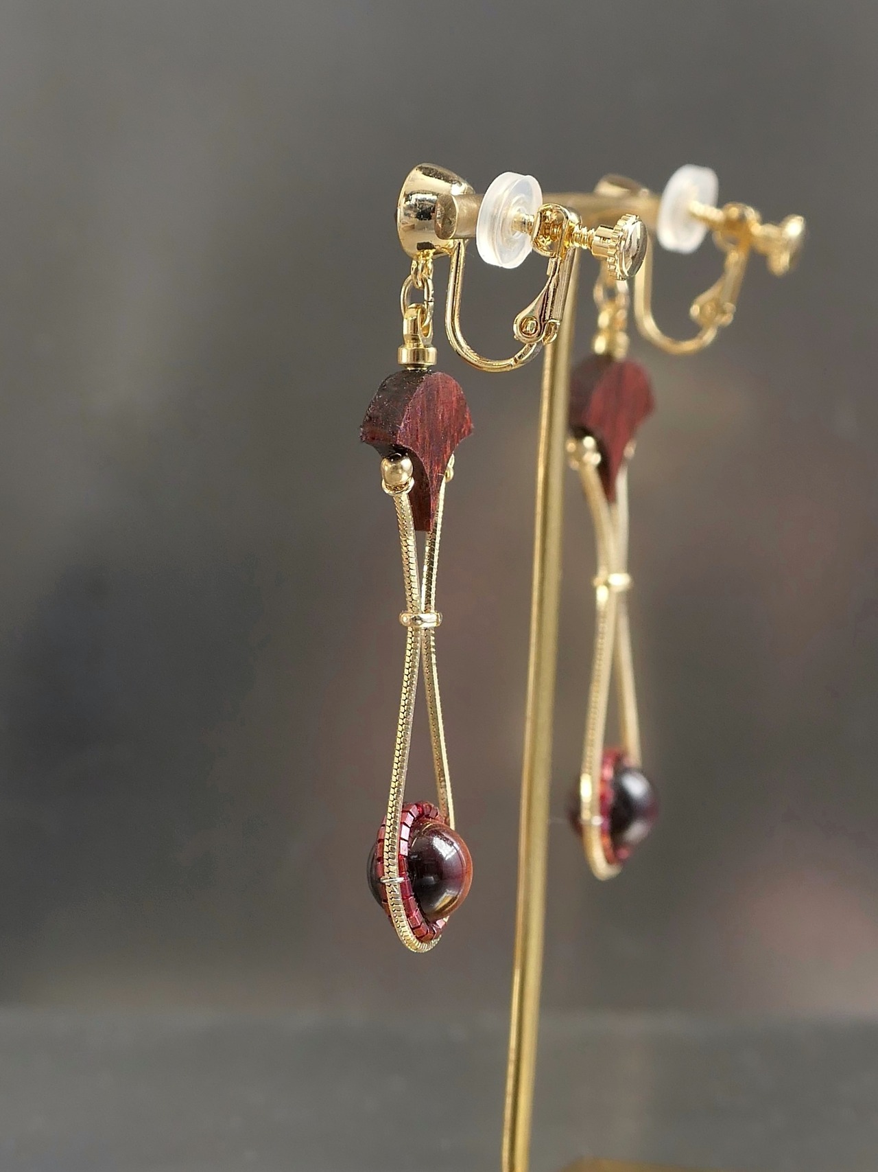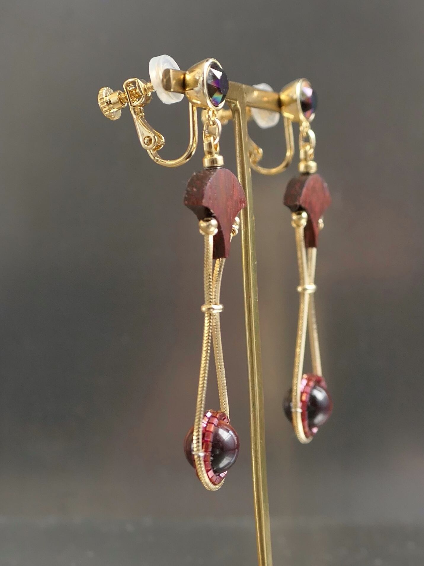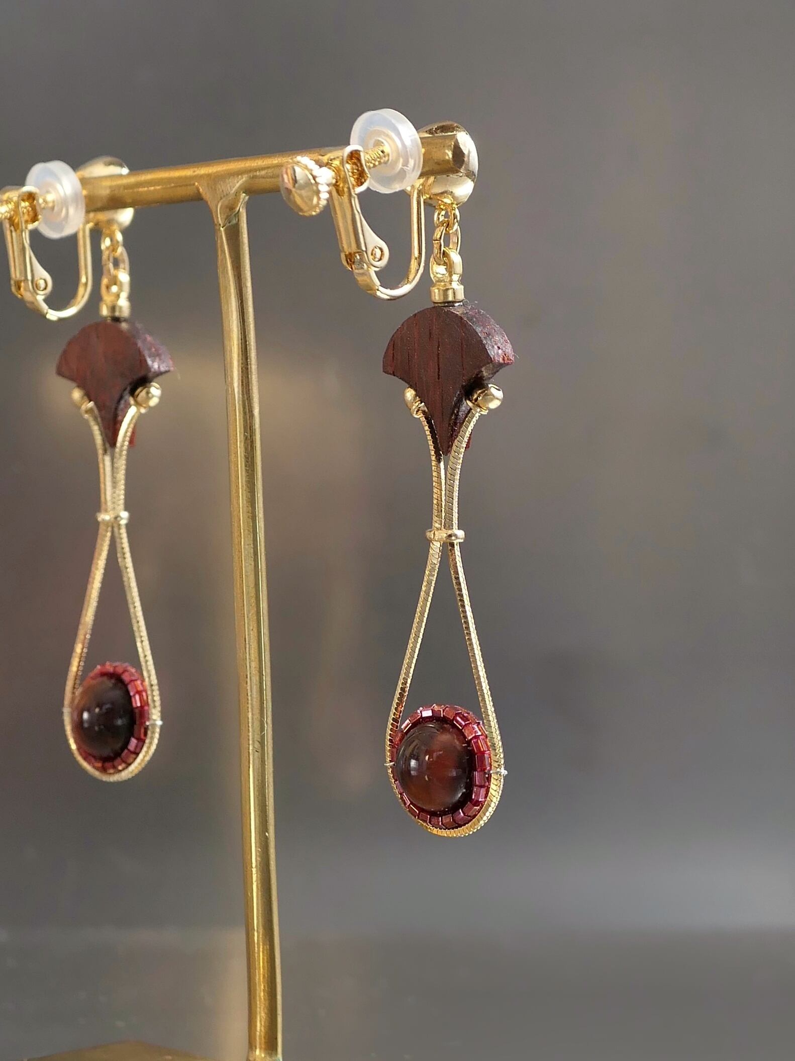 素材:木(パドック)、天然石(タイガーアイ)、硝子(SWAROVSKI社製のクリスタル)、真鍮、ステンレス(ピアスポスト)