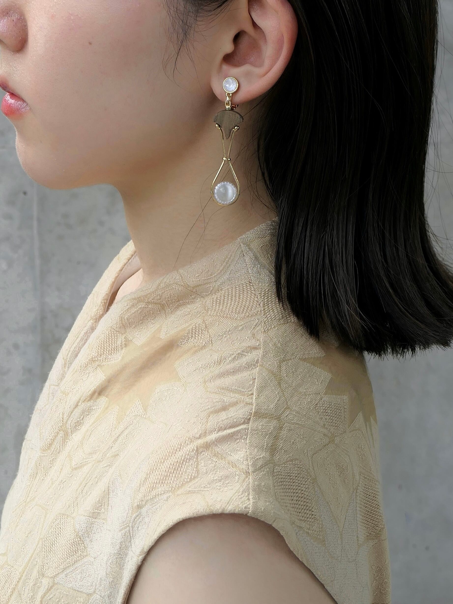木や天然石、硝子を組み合わせたイヤーアクセサリーです。揺れる球は極小ビーズで囲まれており、角度によって光を反射します。