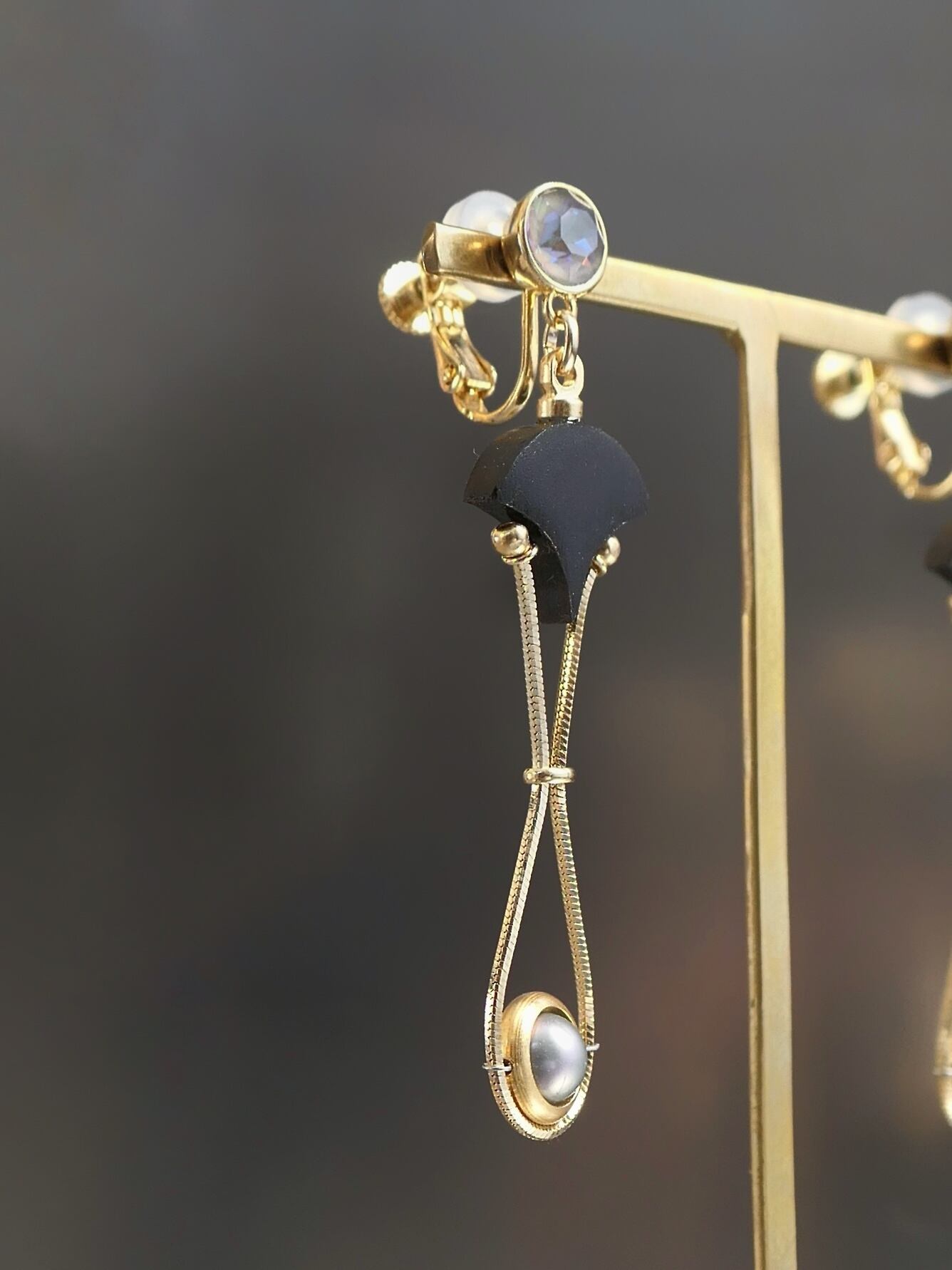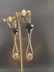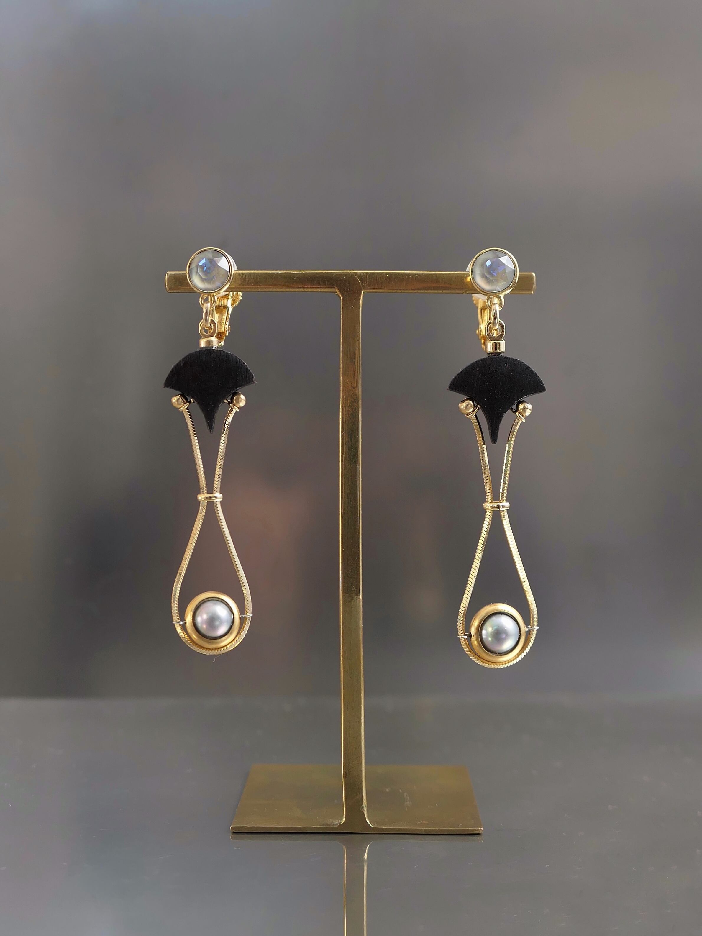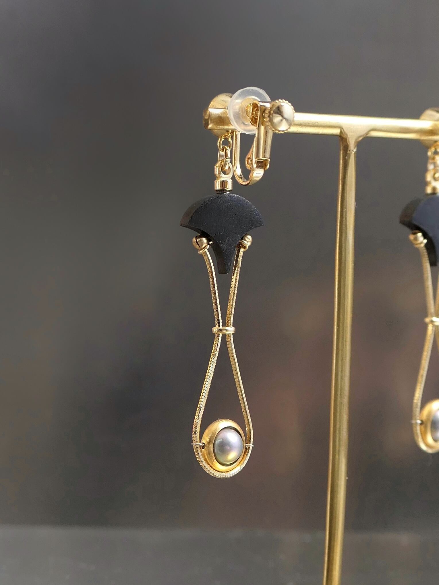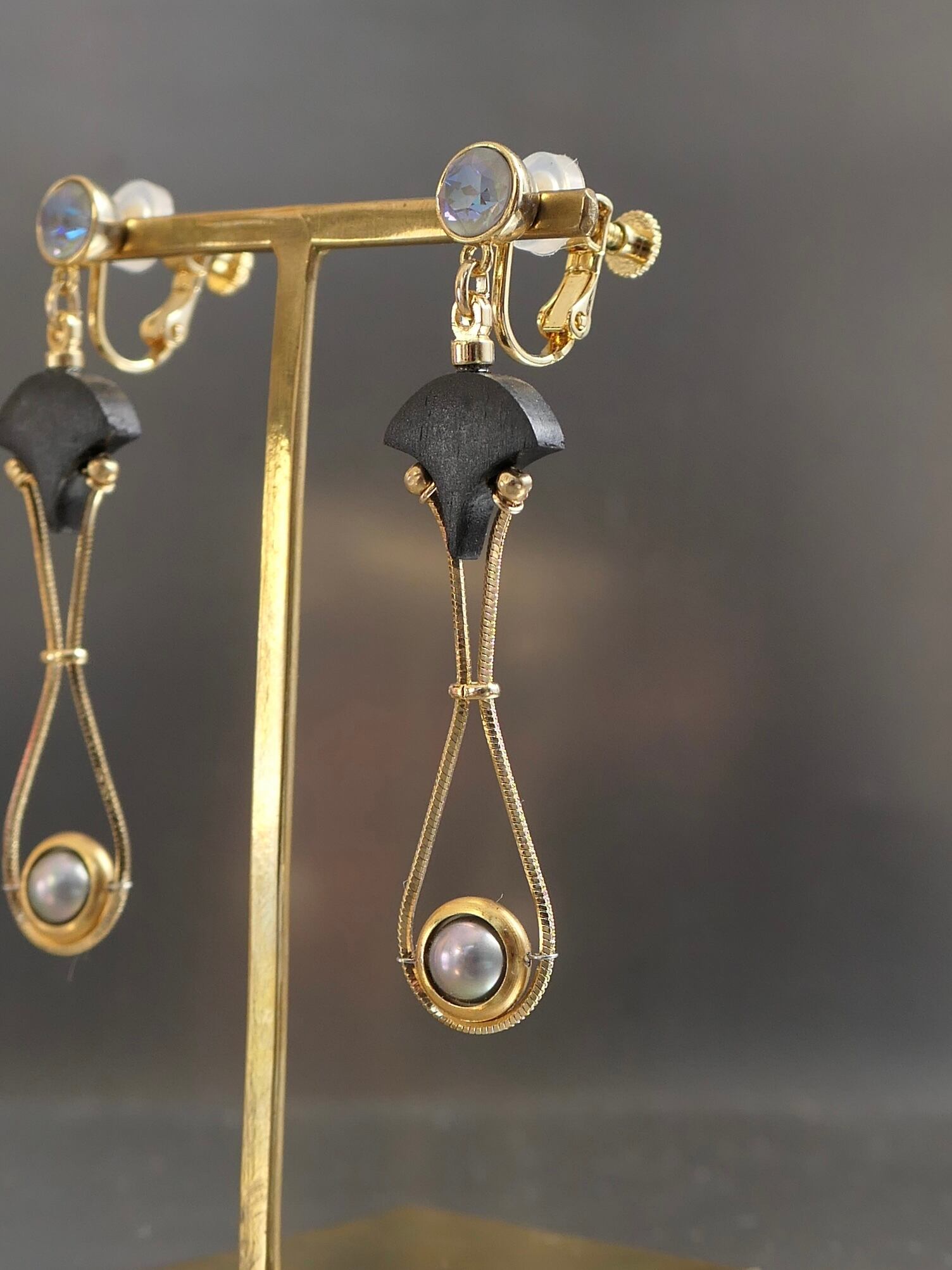 素材:木(アフリカンブラックウッド)、真珠、硝子(SWAROVSKI社製のクリスタル)、真鍮、ステンレス(ピアスポスト)