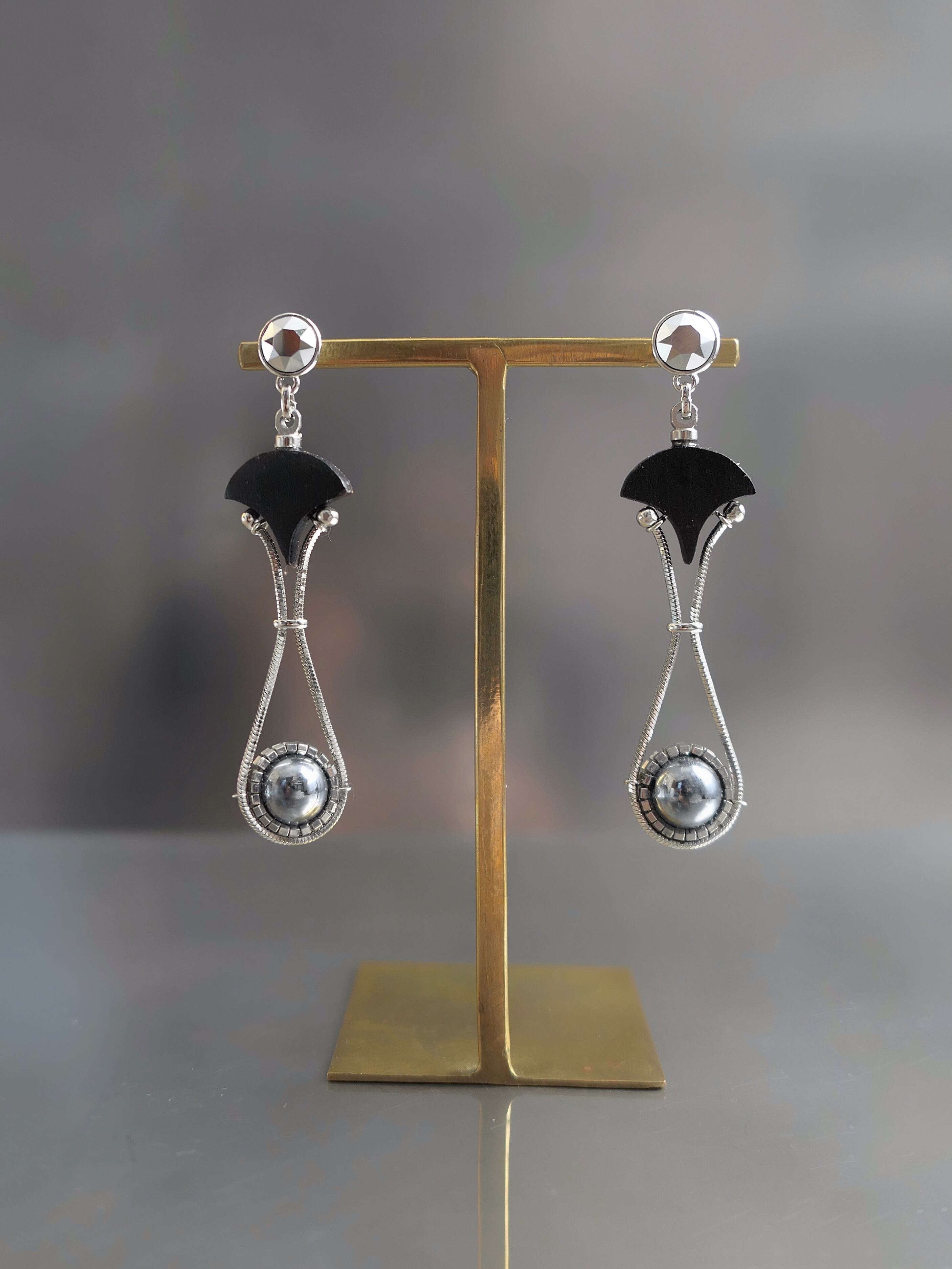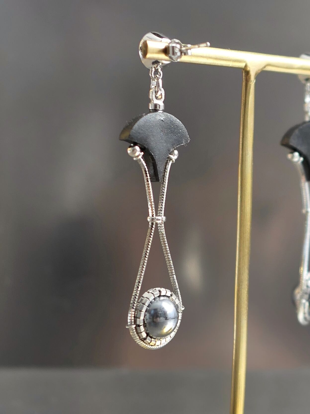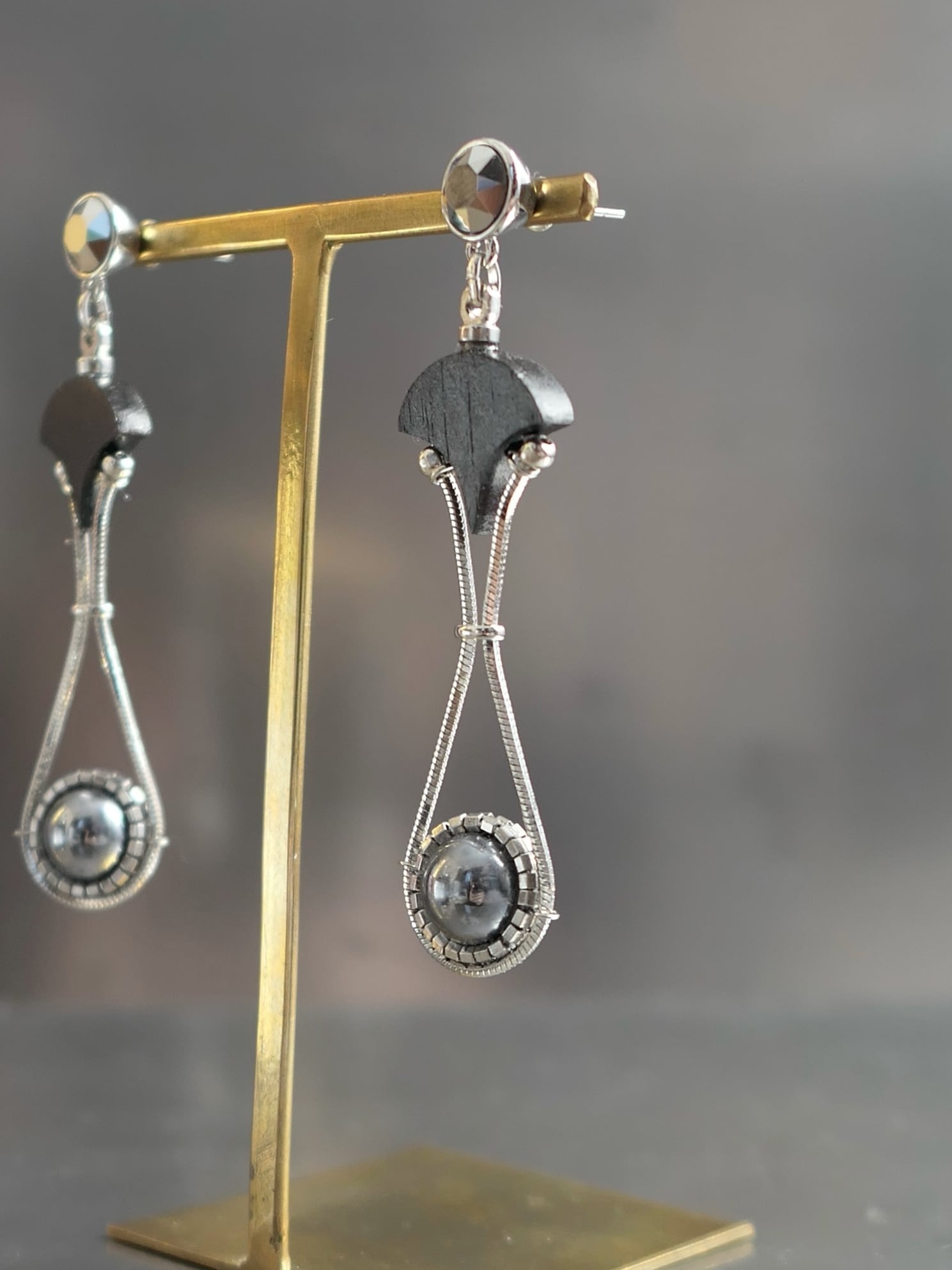 素材:木(アフリカン・ブラックウッド)、鉱石(テラヘルツ)、硝子(SWAROVSKI社製のクリスタル)、真鍮、ステンレス(ピアスポスト)