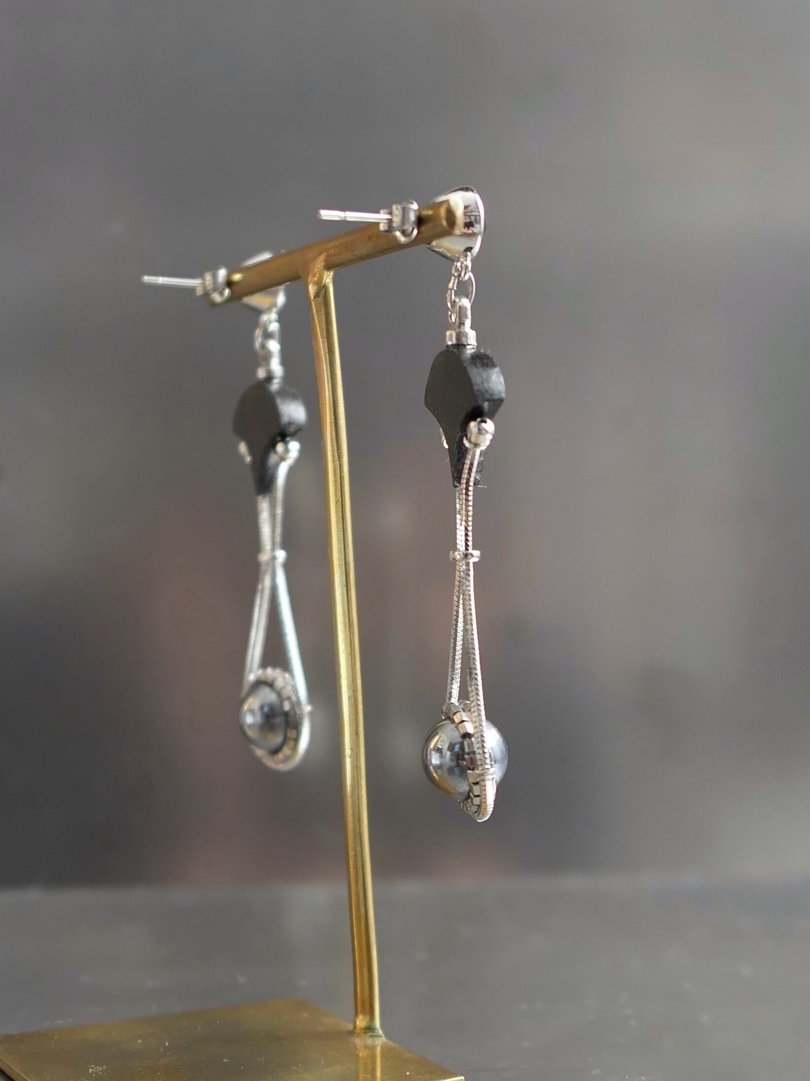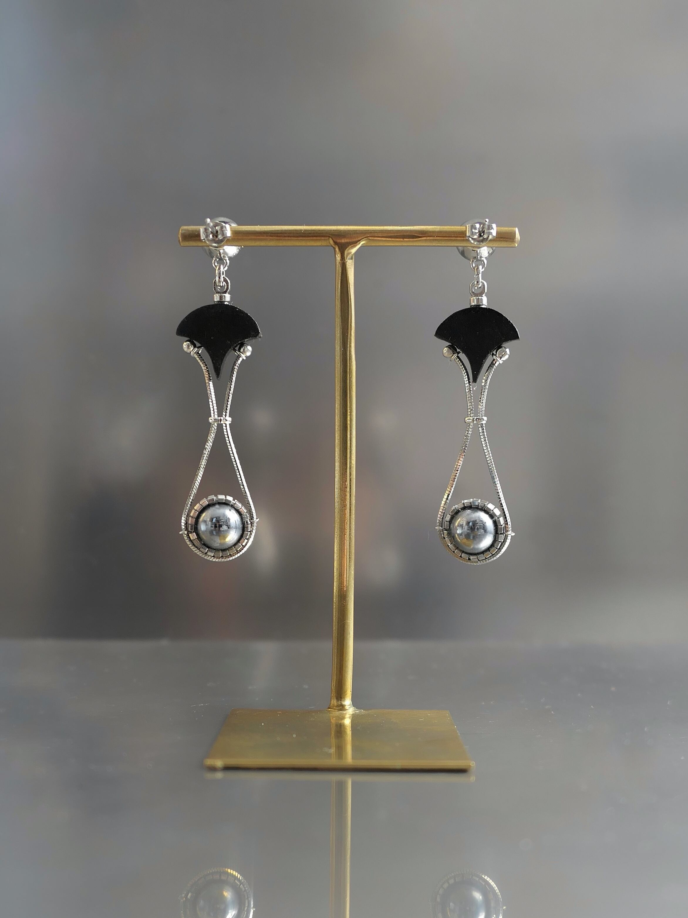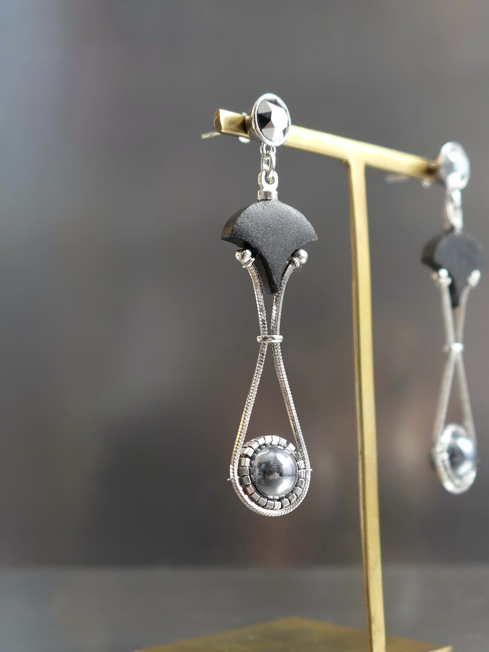 素材:木(アフリカン・ブラックウッド)、鉱石(テラヘルツ)、硝子(SWAROVSKI社製のクリスタル)、真鍮、ステンレス(ピアスポスト)