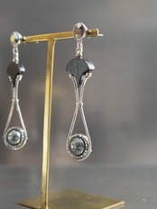 木や天然石、硝子を組み合わせたイヤーアクセサリーです。揺れる鉱石は極小ビーズで囲まれており、角度によってキラキラします。