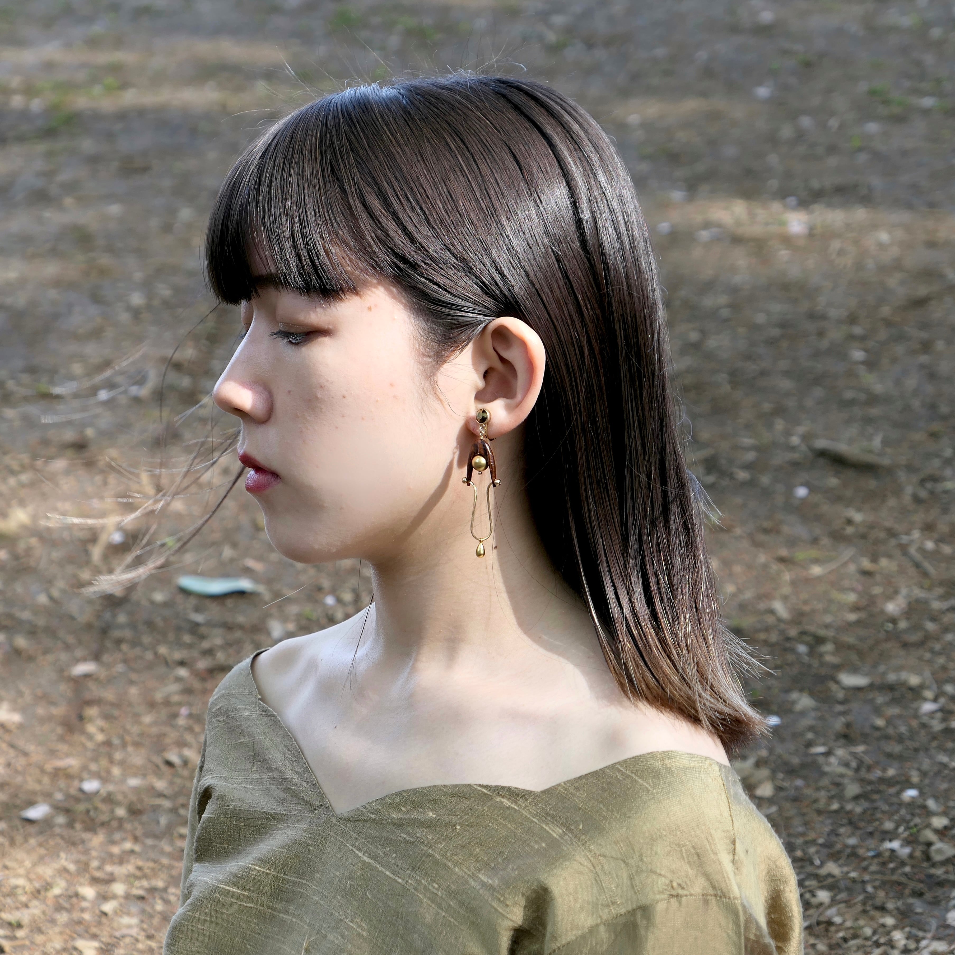 木のアーチから伸びるチェーンのピアスです。とても軽く、何も付けていない様な付け心地です。