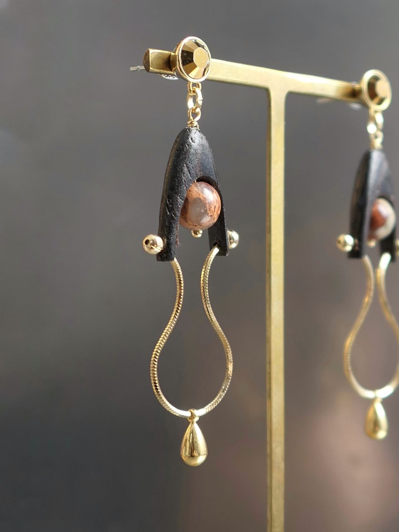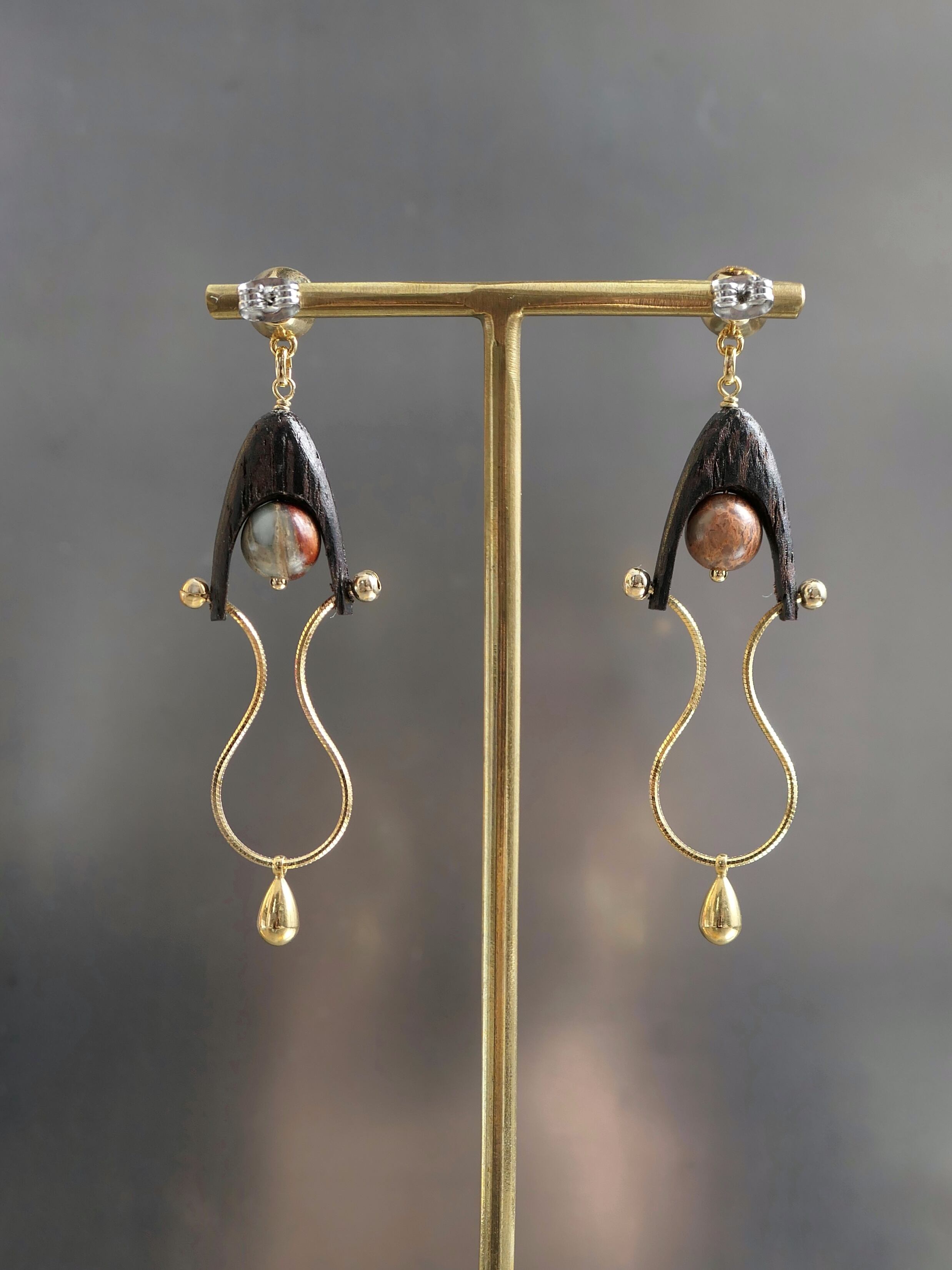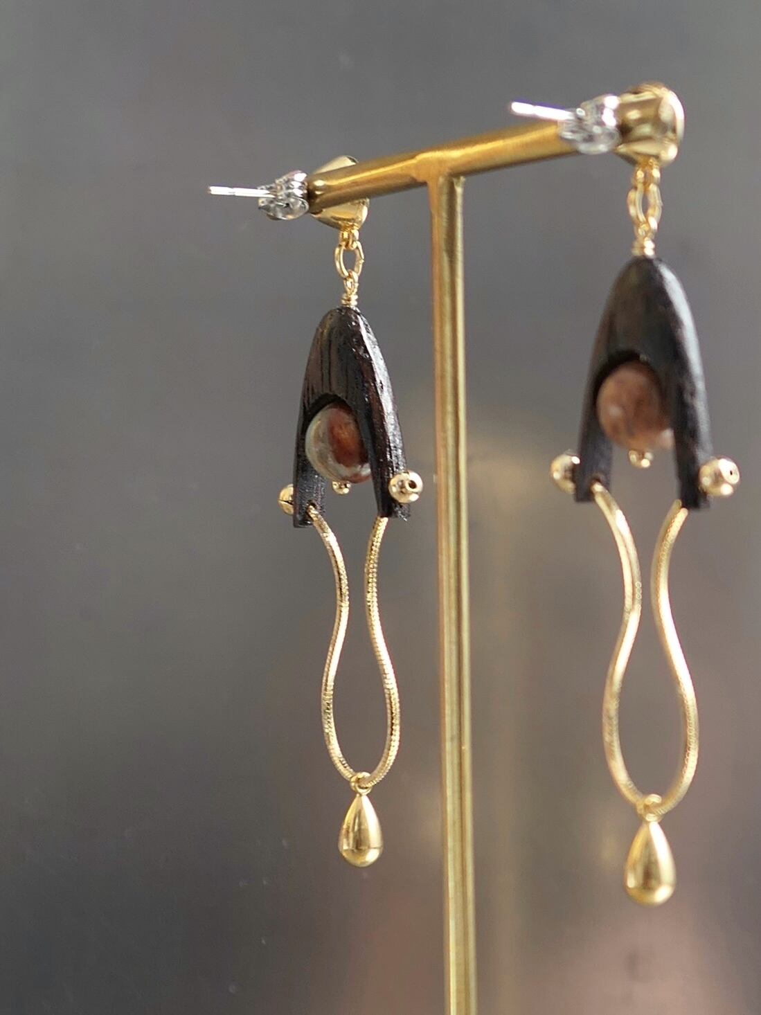 素材:木(ウエンジ)、硝子(SWAROVSKI社製のクリスタル)、天然石(インプレッションストーン)、真鍮、ステンレス(ピアスポスト)