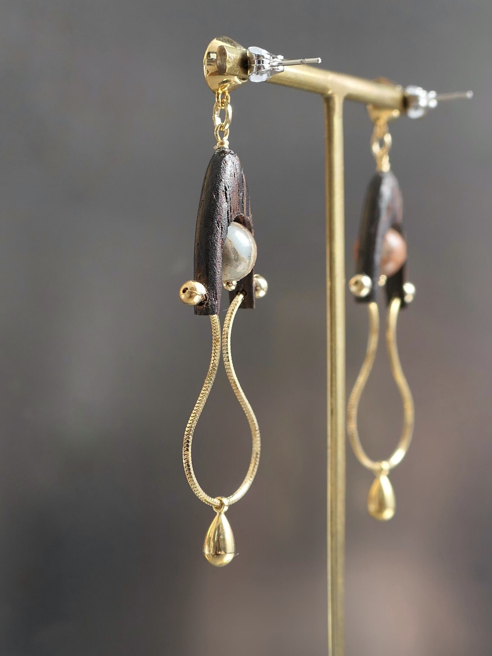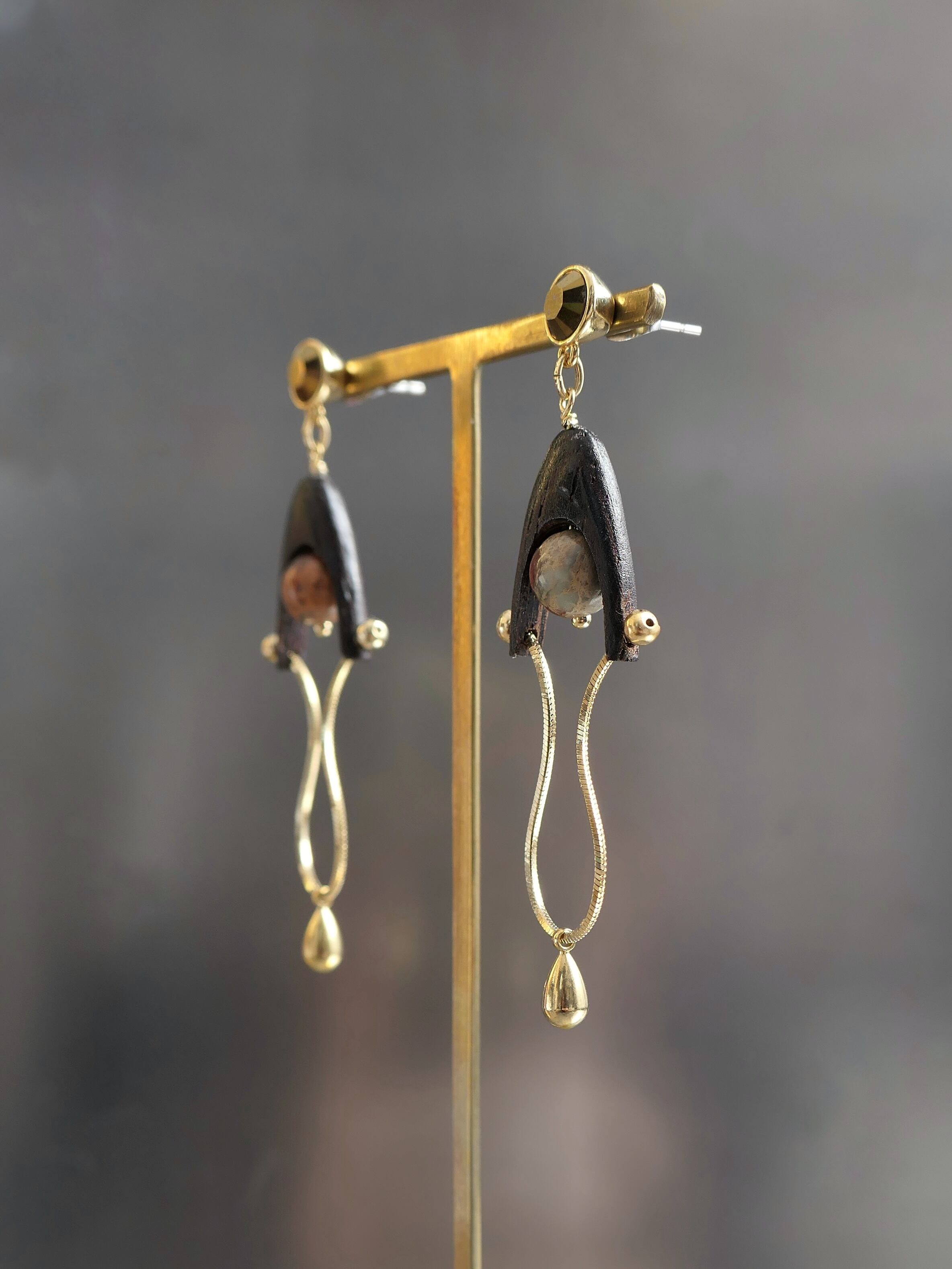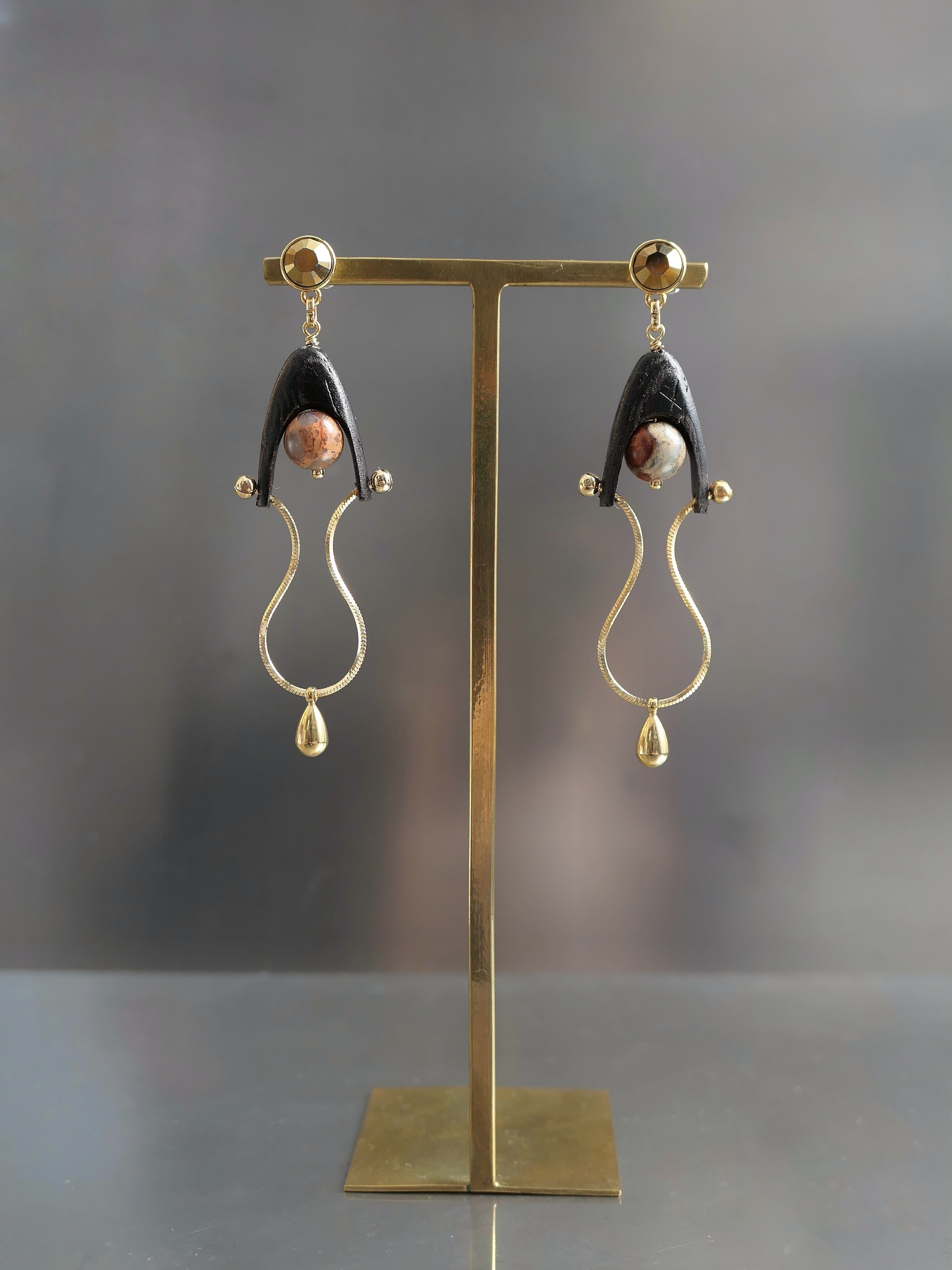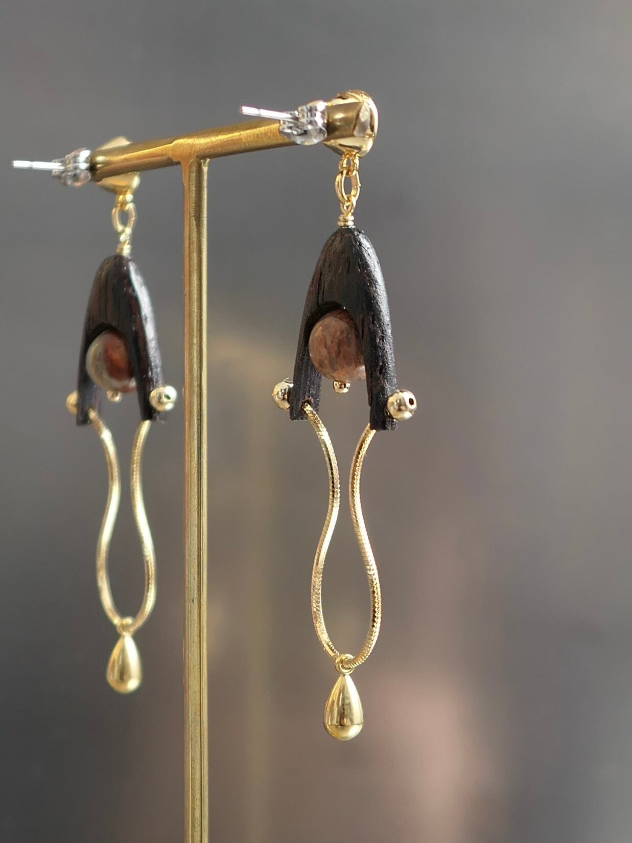 素材:木(ウエンジ)、硝子(SWAROVSKI社製のクリスタル)、天然石(インプレッションストーン)、真鍮、ステンレス(ピアスポスト)