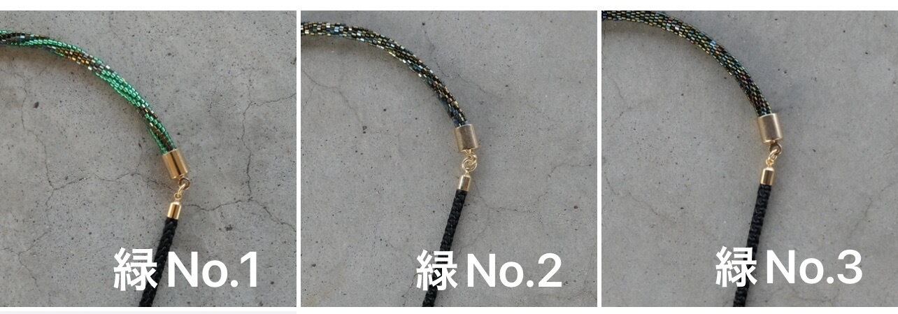 500粒のビーズを編んで作ったパーツをチェーンと組み合わせたネックレスです。一点一点手作業のためカーブに差がありますが、使用することで首に馴染みます。
