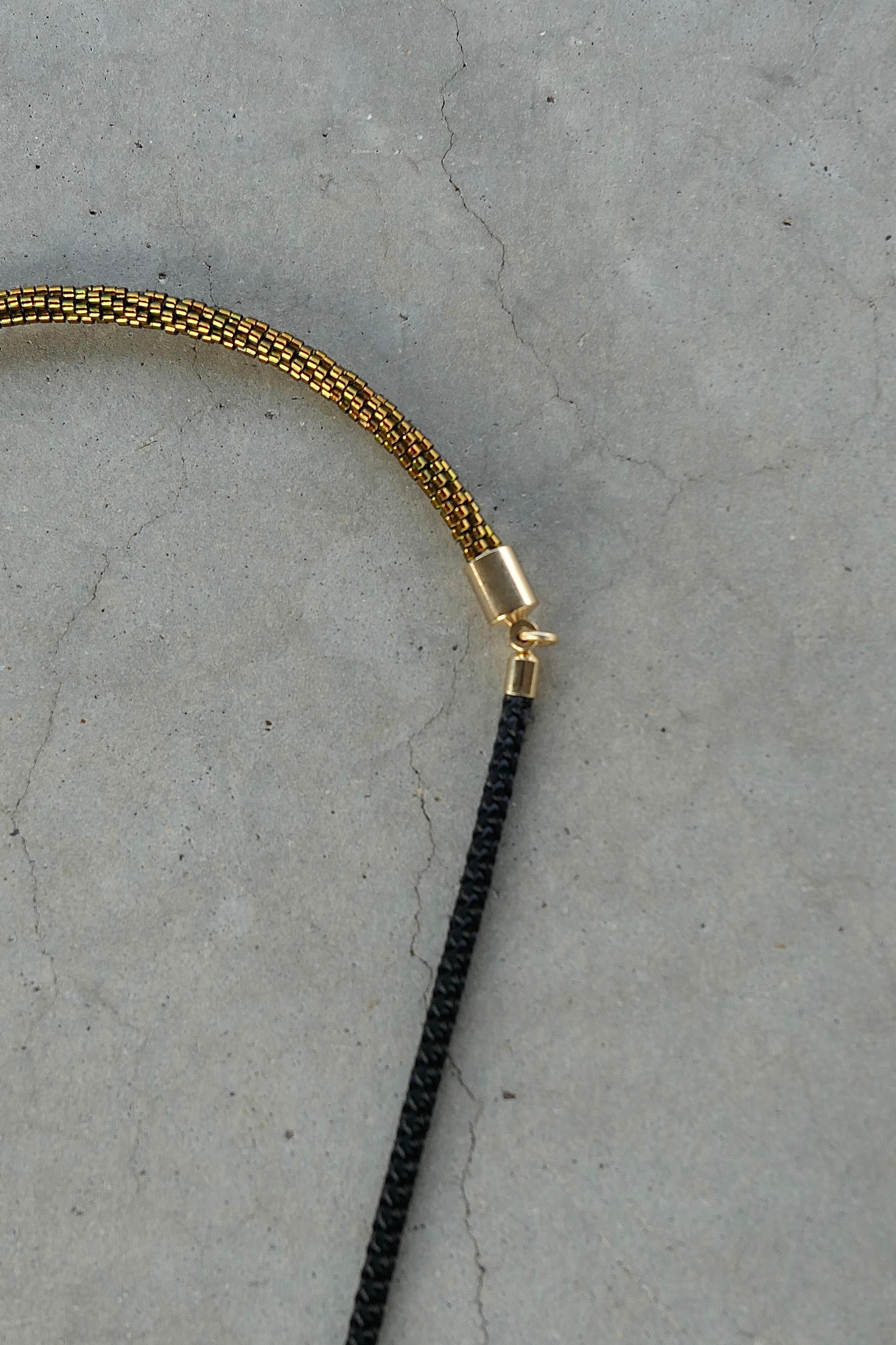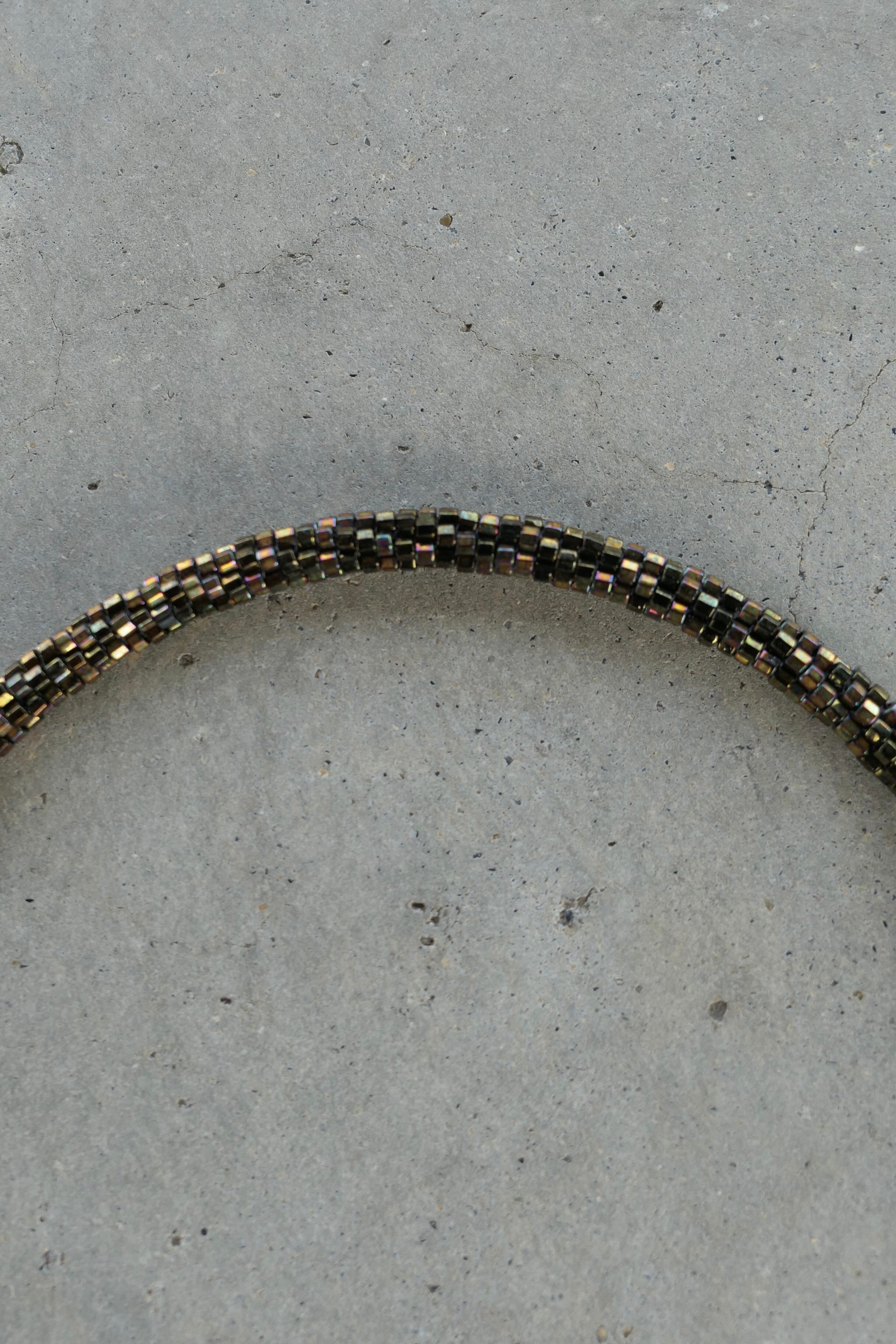 500粒のビーズを編んで作ったパーツをチェーンと組み合わせたネックレスです。一点一点手作業のためカーブに差がありますが、使用することで首に馴染みます。