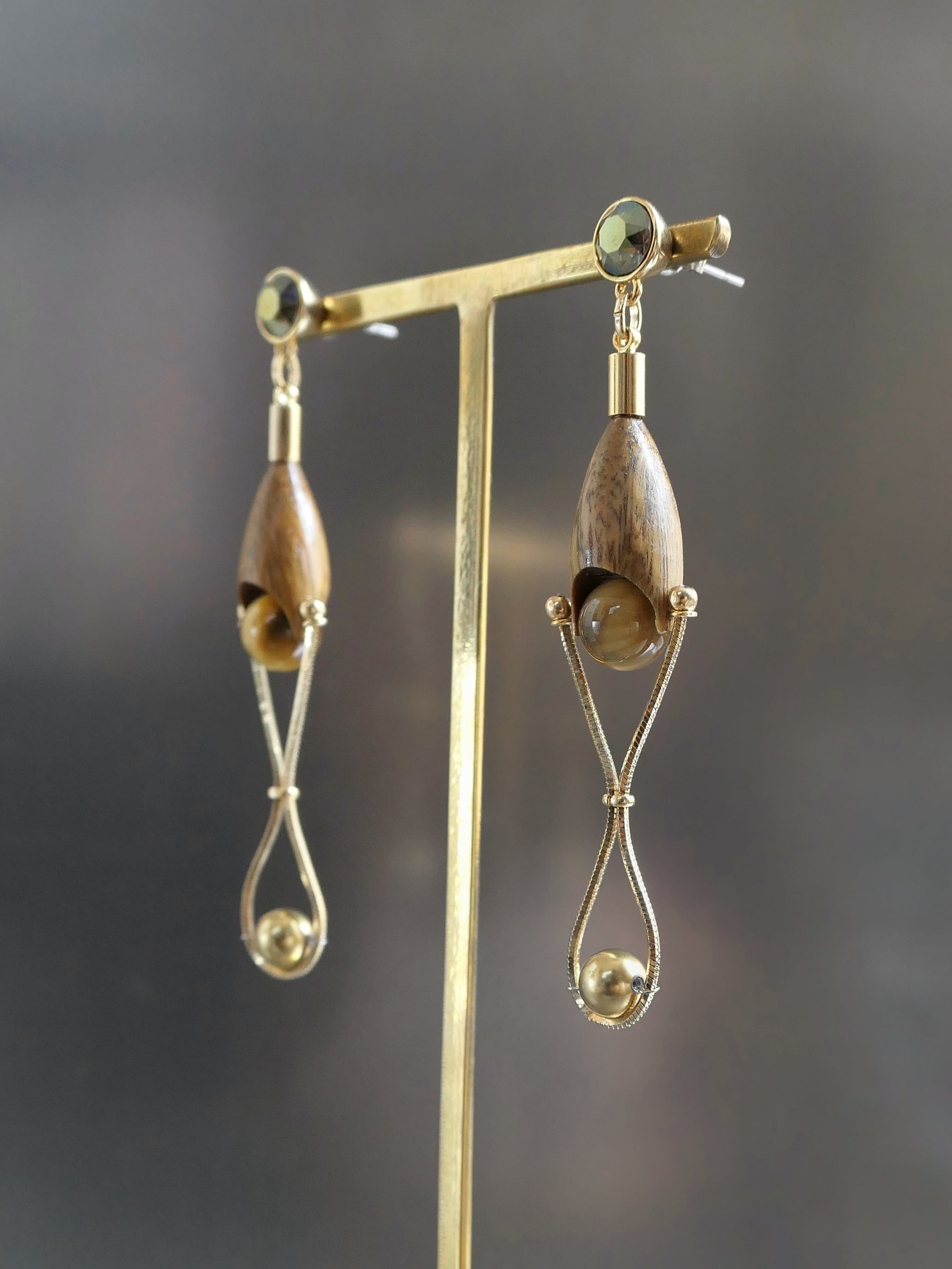素材:木(パロサント)、天然石(タイガーアイ)、硝子、真鍮、ステンレス(ピアスポスト)